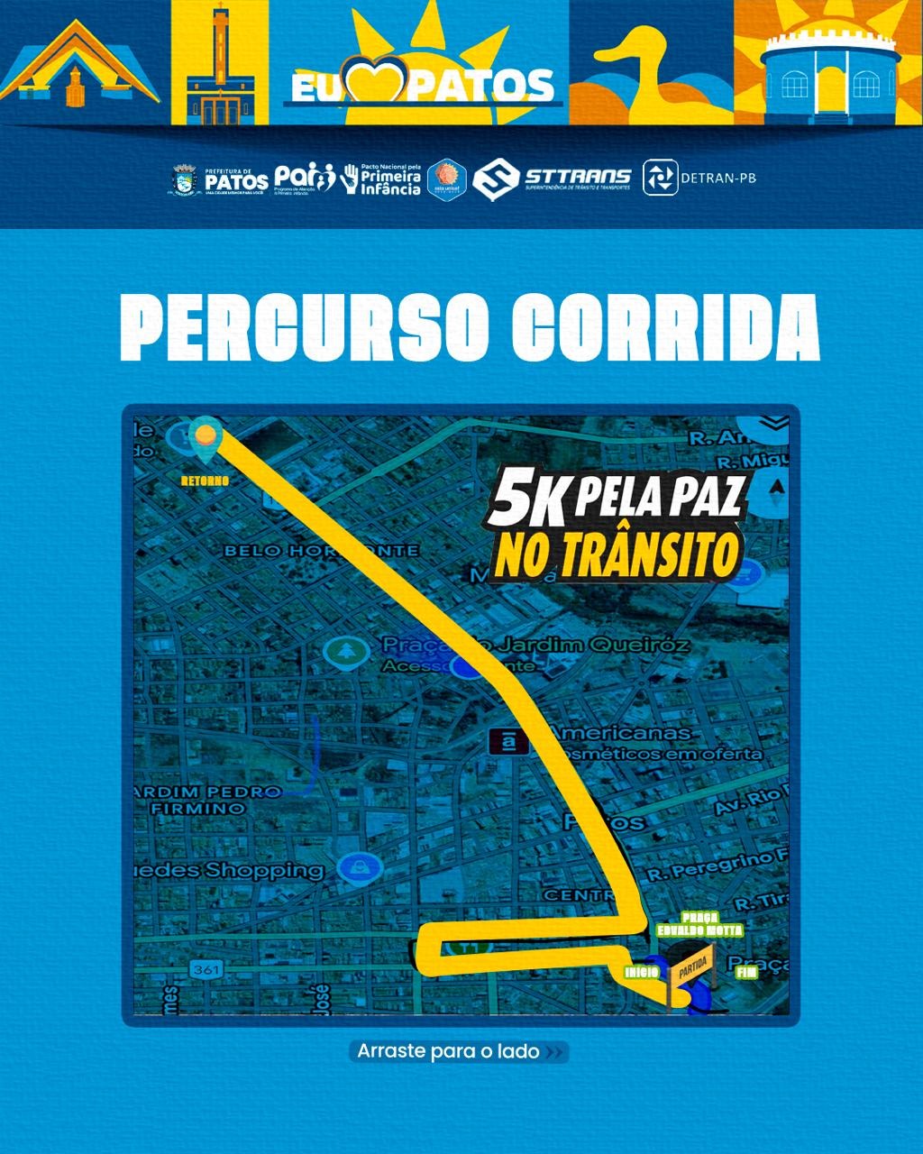 A cidade de Patos será palco, neste domingo, 26 de outubro, da 1ª Corrida pela Paz no Trânsito, um evento promovido pelo DETRAN-PB, em parceria com a Superintendência de Trânsito e Transporte - STTRANS, com o objetivo de incentivar a conscientização, a educação e o respeito no trânsito.