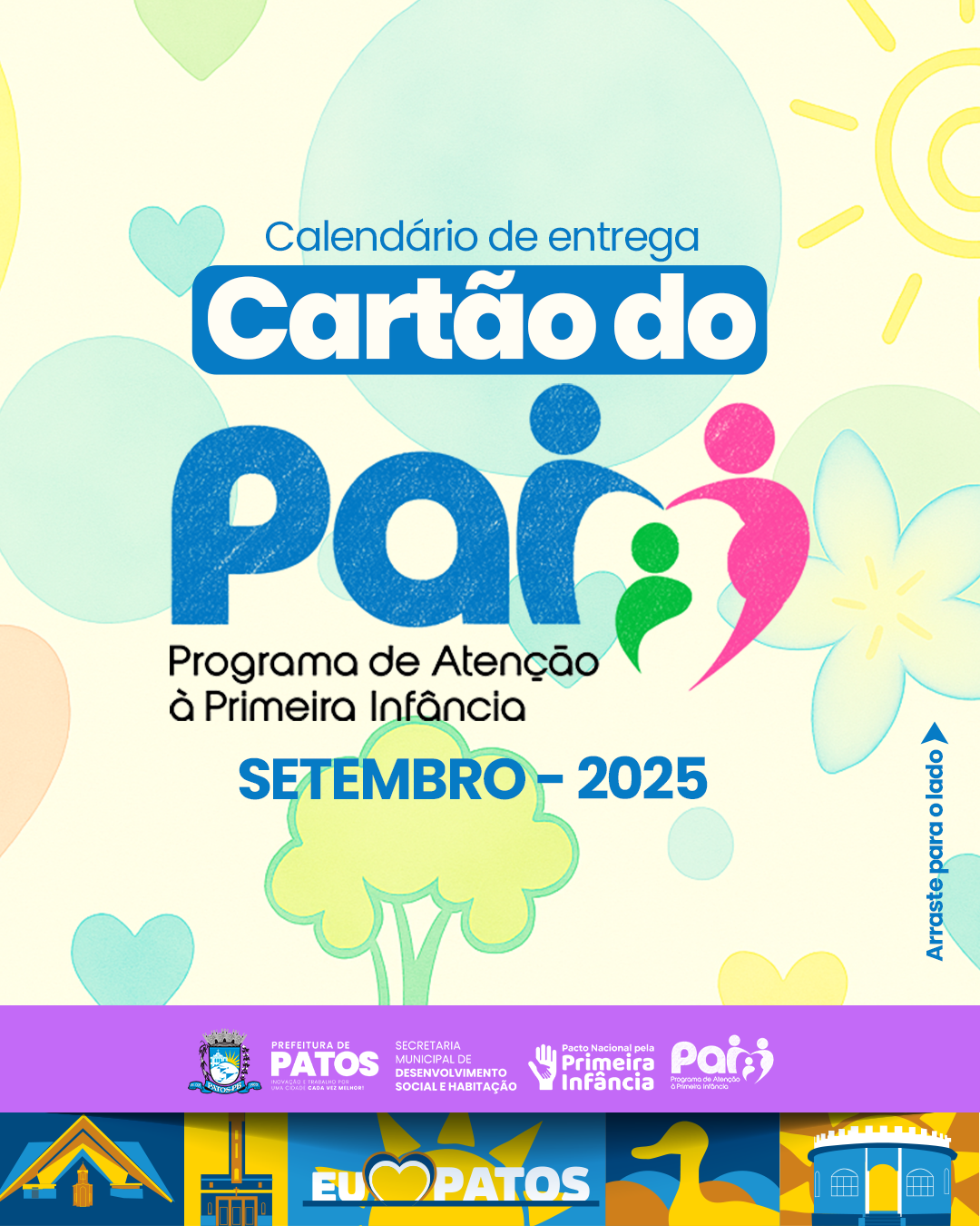 A Prefeitura de Patos, por meio da Secretaria de Desenvolvimento Social e Habitação, divulga o calendário de entrega do Cartão do PAI referente ao mês de setembro. O pagamento acontece dentro do mês, seguindo dias, turnos e horários organizados para melhor atender os beneficiários.