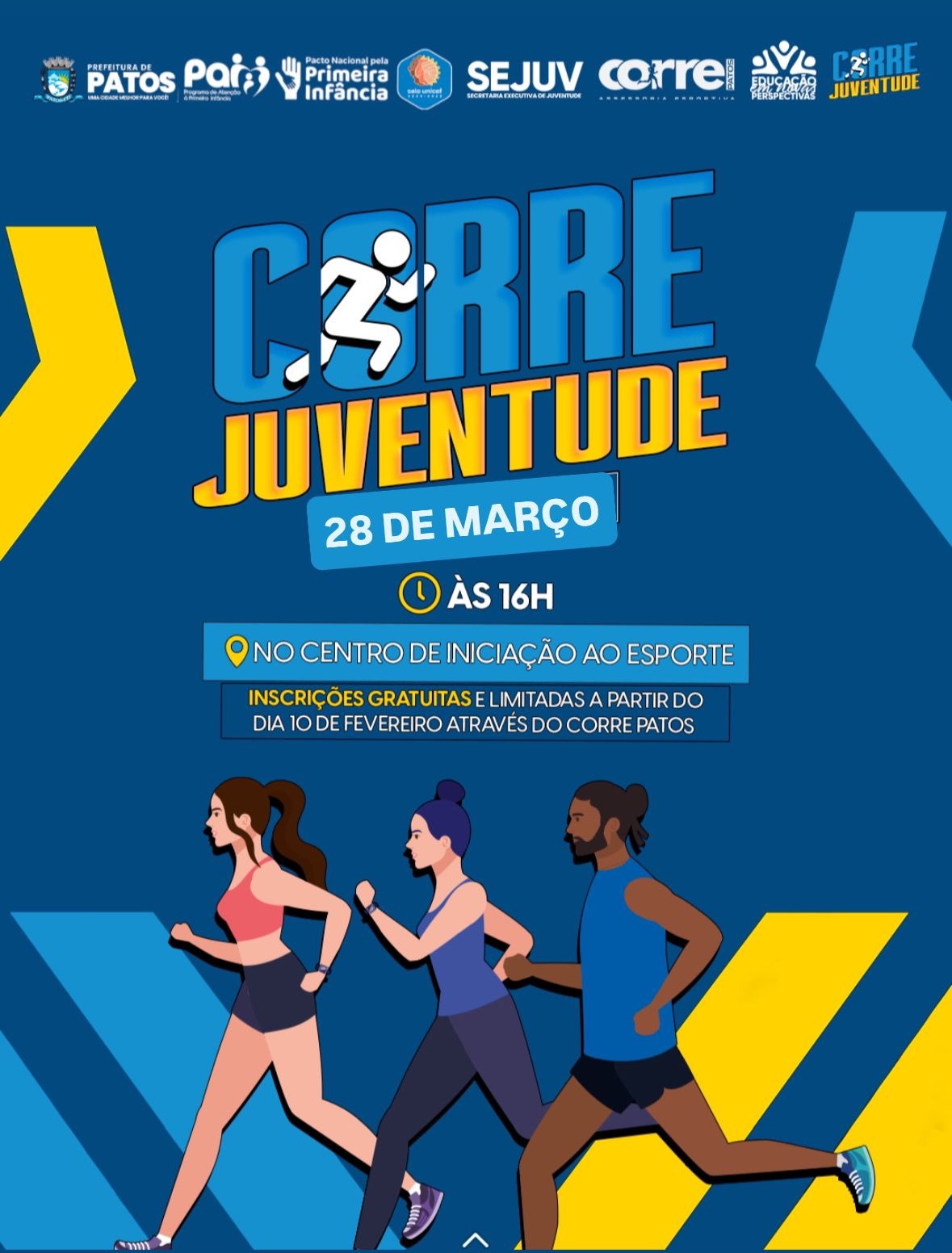 O Corre Juventude é uma realização da Prefeitura de Patos, por meio da Secretaria de Educação de Patos e da Secretaria Executiva de Juventude de Patos, em parceria com o Corre Patos. A união das instituições reforça o compromisso do município em criar oportunidades para que a juventude tenha acesso ao esporte e a atividades que promovam qualidade de vida.