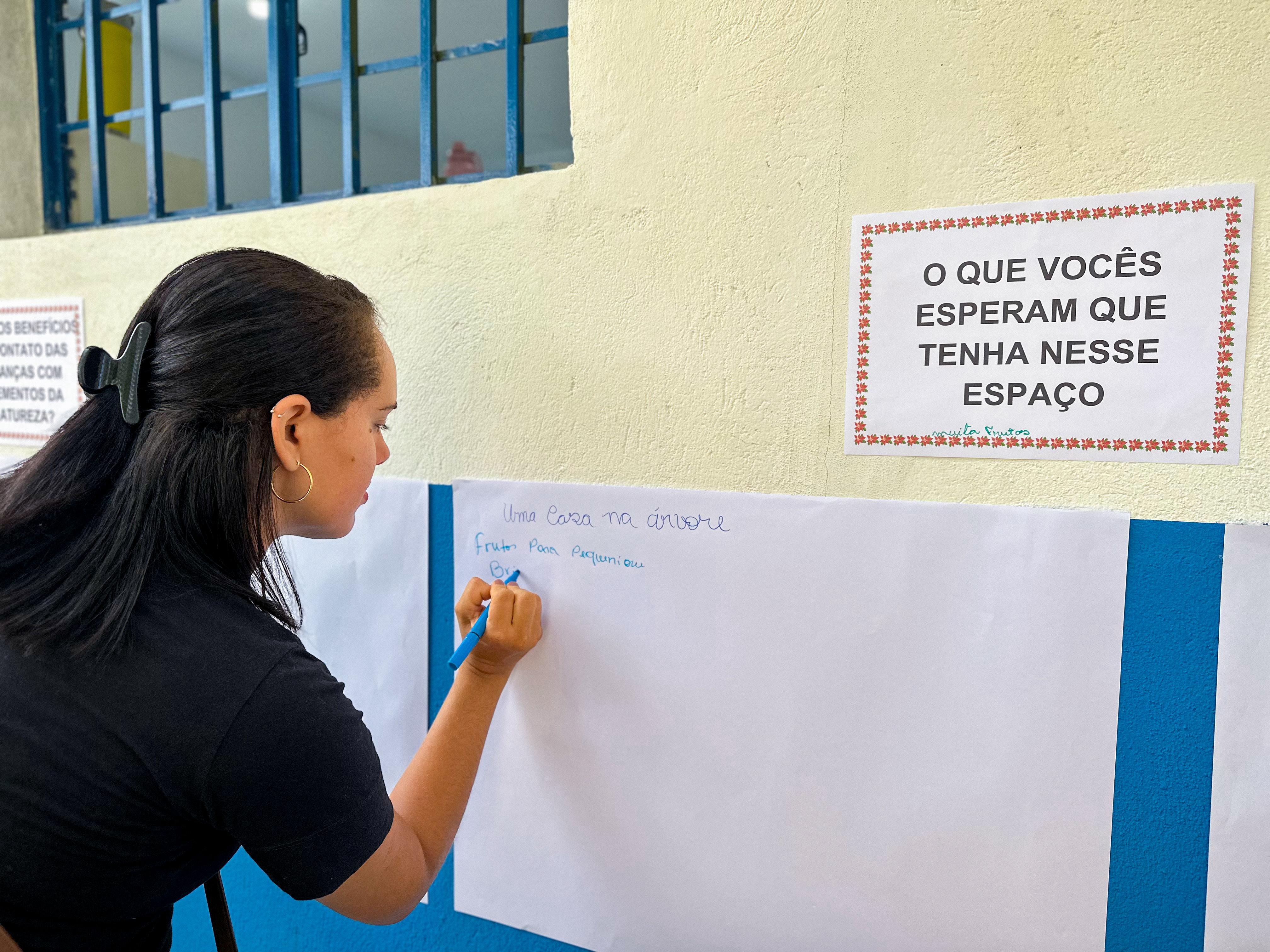 Durante a conversa, os familiares trouxeram ideias para tornar o espaço mais acolhedor e explorável pelas crianças, como balanços de pneu, brinquedos feitos com troncos, chuveirinhos e áreas para plantar. Eles também refletiram sobre como o contato com elementos naturais favorece o desenvolvimento infantil, e um dos registros feitos no quadro resumiu esse sentimento ao apontar que a natureza incentiva as crianças a “explorar, criar e imaginar”.