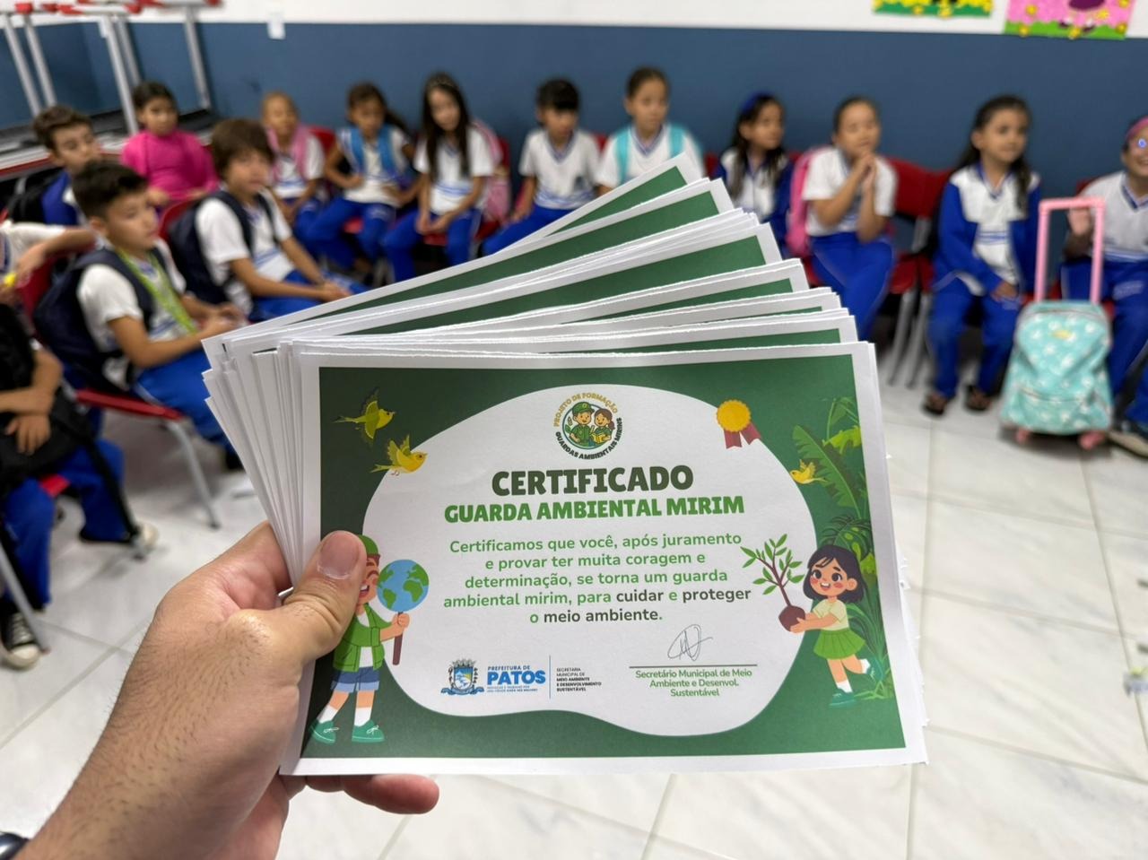 Uma ação voltada à conscientização ambiental marcou a quinta-feira (23) na EMEF Professora Marlene Neves dos Santos, localizada no bairro Salgadinho, em Patos. A atividade foi promovida pela Secretaria de Meio Ambiente e Desenvolvimento Sustentável (SEMADS), com a implantação do projeto Guardas Ambientais Mirins.