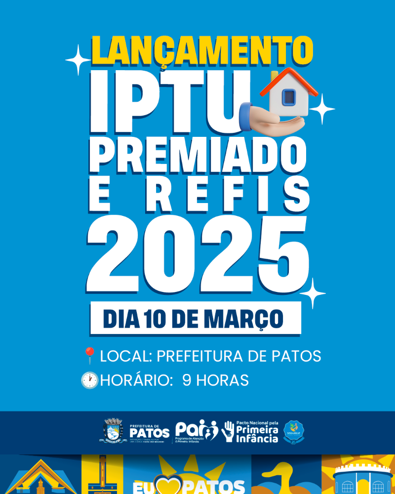 A Prefeitura de Patos, por meio da Secretaria da Receita tem o prazer de convidar a todos para o lançamento do IPTU Premiado 2025 e do Programa de Recuperação Fiscal (Refis -Patos 2025), iniciativas que visam incentivar a adimplência dos contribuintes e proporcionar condições especiais para a regularização de débitos.