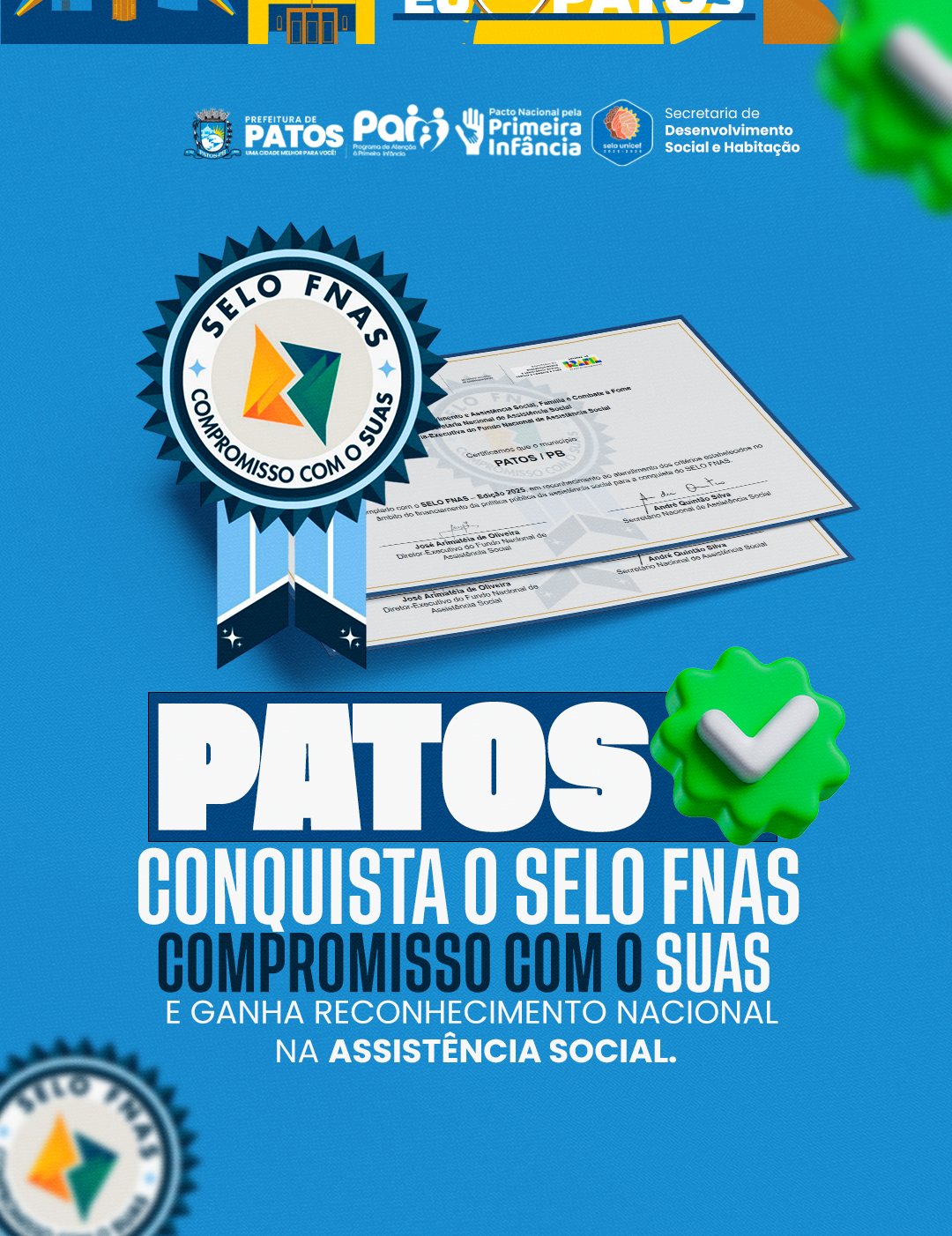 O município de Patos foi contemplado com o Selo FNAS – Edição 2025, um reconhecimento concedido aos municípios que atendem aos critérios estabelecidos no financiamento da política pública de Assistência Social. A certificação reforça o compromisso com a qualidade dos serviços ofertados e com o cuidado às pessoas atendidas pela rede socioassistencial.