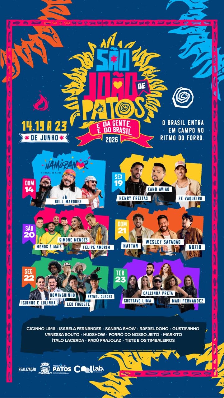 A Prefeitura de Patos anunciou, na manhã desta segunda-feira (16), a programação oficial do São João de Patos 2026, considerado um dos maiores festejos juninos do Nordeste. O evento será realizado entre os dias 14 e 23 de junho, no Terreiro do Forró, por meio de uma parceria público-privada entre o município e a empresa Collab Creative.