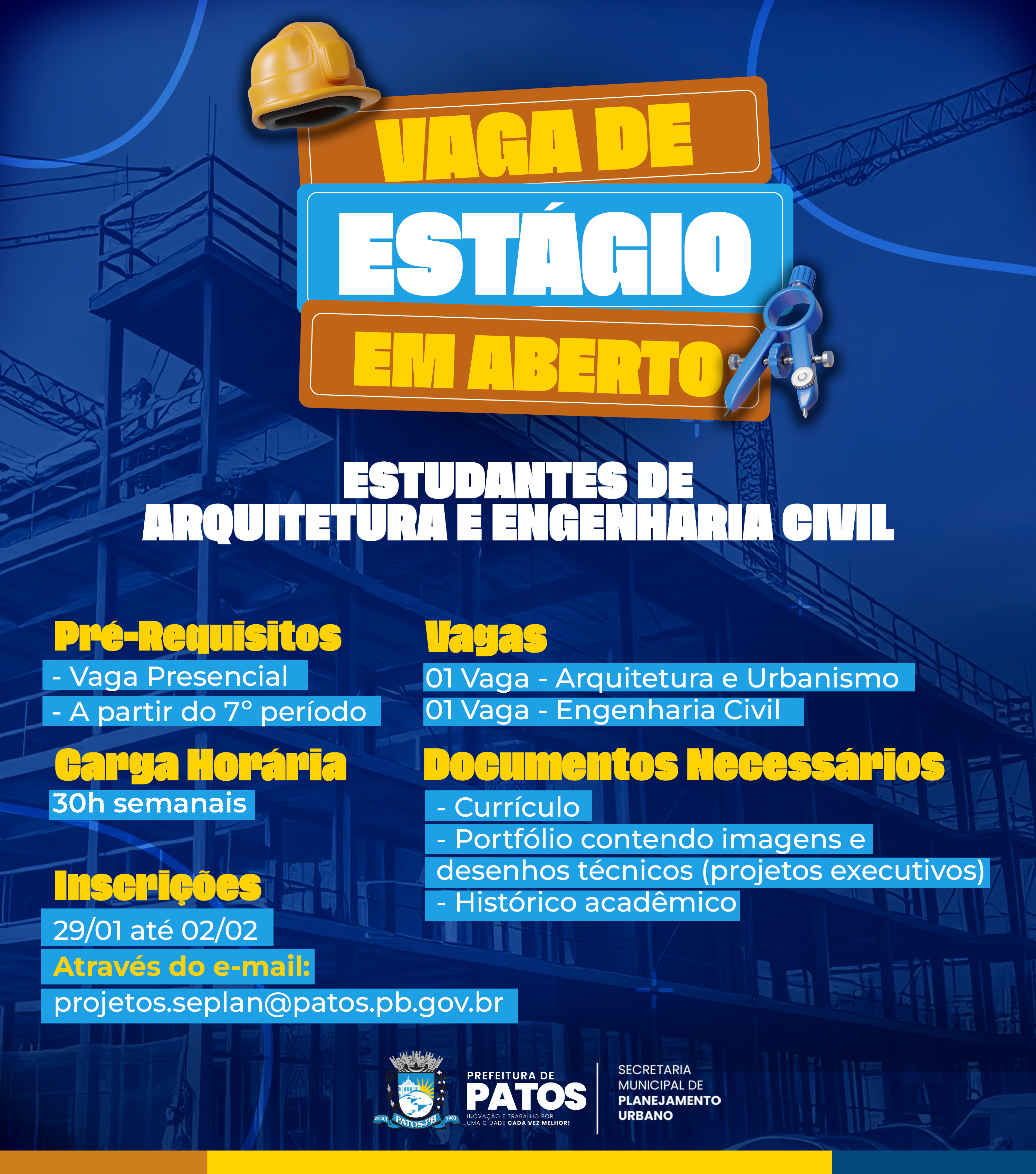 A Prefeitura de Patos, por meio da Secretaria de Planejamento Urbano abre nesta quarta-feira, 29 de janeiro, inscrições para PROCESSO DE SELEÇÃO DE ESTÁGIO para o preenchimento de 2 vagas, uma para cada curso, na modalidade de estágio não obrigatório e a formação de cadastro de reserva de estágio de estudantes de nível superior.