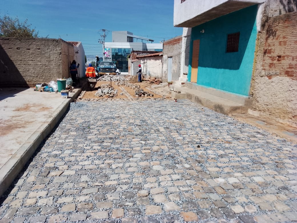 No bairro das Placas, a Prefeitura segue com a construção do calçamento da rua que dá acesso à nova praça que está sendo edificada pela gestão municipal — a primeira Praça da Infância de Patos. No mesmo local, estão sendo feitos os últimos ajustes nos bancos de alvenaria que irão compor o espaço de lazer e convivência.