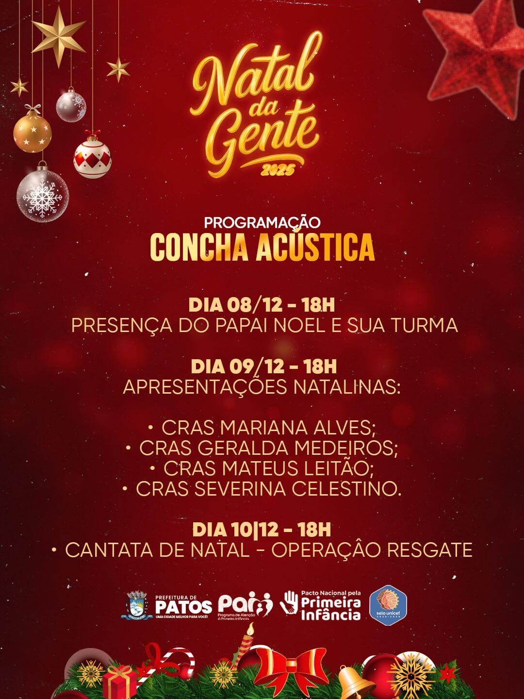 A Prefeitura de Patos anunciou, por meio das redes sociais da Secretaria de Cultura, Turismo e Esporte (SECULTE), a programação cultural do Natal da Gente 2025, que será realizada na Concha Acústica, localizada na Praça Edivaldo Motta.