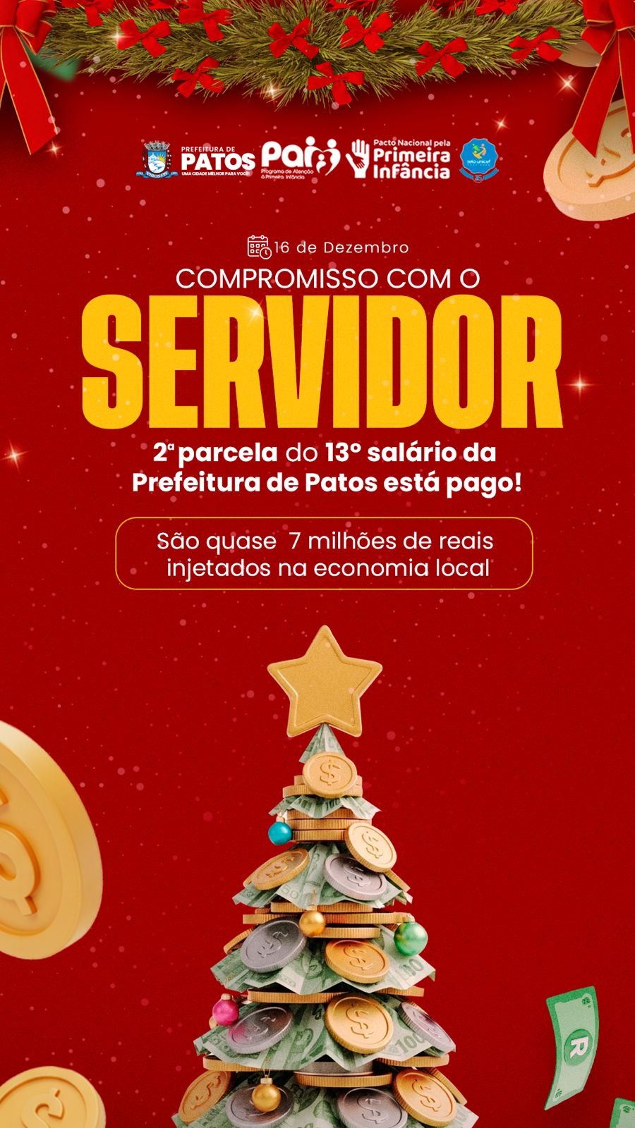 Com a liberação dos recursos, a administração municipal injeta quase R$ 7 milhões na economia patoense, fortalecendo o comércio, o setor de serviços e impulsionando a geração de emprego e renda neste período de fim de ano.