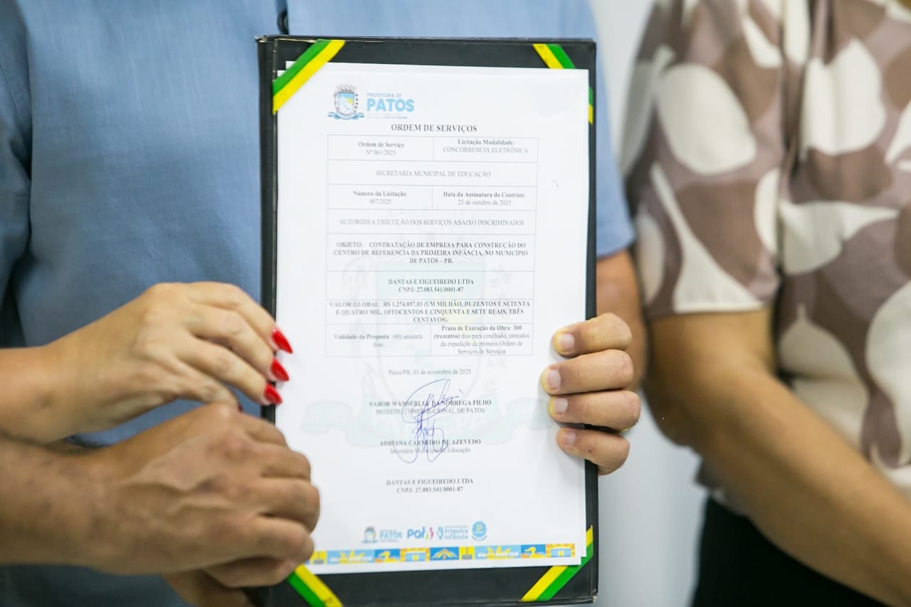 A Prefeitura de Patos assinou, na manhã desta terça-feira (16), a ordem de serviço para a construção da quadra esportiva da ECIM CIEP III Firmino Ayres/Otto Quinho. A solenidade foi realizada às 9h, na Rua Manoel Reinaldo, no bairro Jatobá, local onde a nova estrutura será implantada, e foi conduzida pelo prefeito Nabor Wanderley.