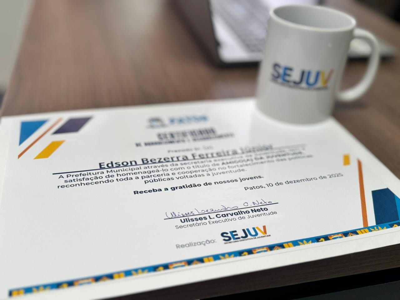 A Prefeitura de Patos, por meio da Secretaria Executiva de Juventude, lançou o Certificado Amigo da Juventude, iniciativa que tem como objetivo reconhecer pessoas e instituições que contribuíram diretamente para o fortalecimento das políticas públicas voltadas à juventude no município ao longo do ano de 2025.