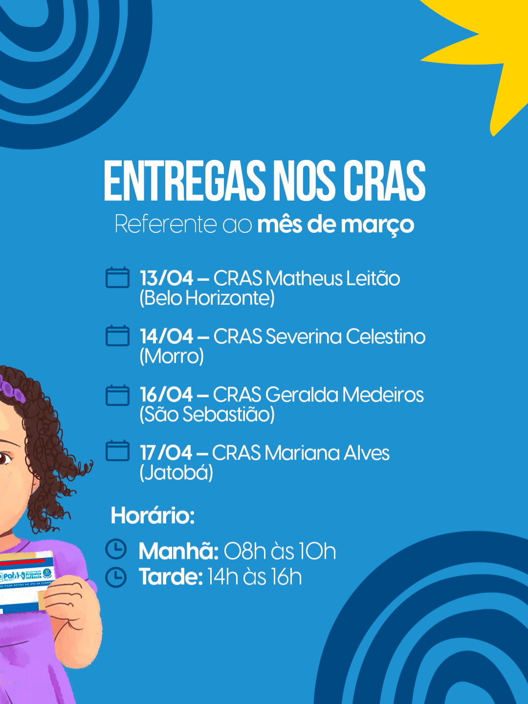 A entrega para novas beneficiárias acontecerá no dia 15 de abril, no Auditório da UEPB, a partir das 8h. Já as demais entregas serão realizadas nos Centros de Referência de Assistência Social (CRAS), conforme cronograma: