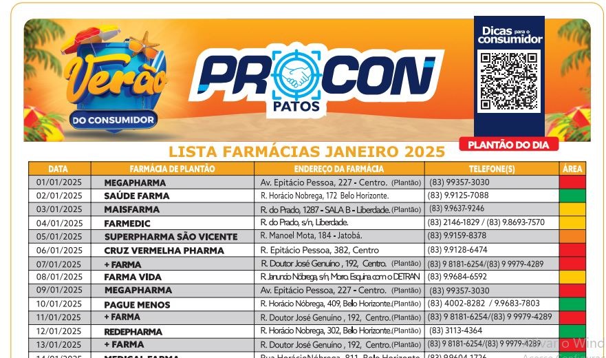Para orientar o consumidor patoense, o Procon divulgou, nesta quinta-feira, dia 02 de janeiro, a lista de farmácias plantonistas para este mês.