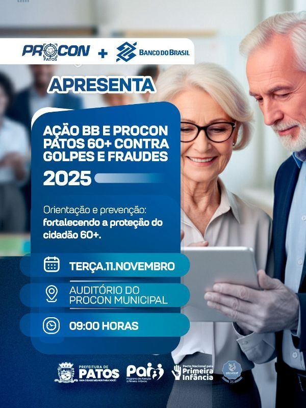 O Procon/Patos, em parceria com o Banco do Brasil, realizará, nesta terça-feira, dia 11 de novembro, às 9h, uma palestra intitulada 'Ação BB e Procon Patos 60+ contra golpes e fraudes'.