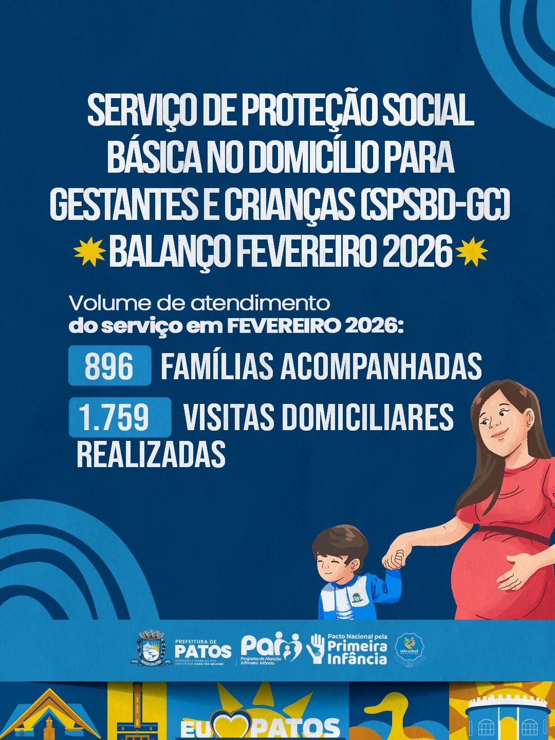 A Vigilância Socioassistencial da Secretaria de Desenvolvimento Social e Habitação divulgou o balanço referente ao mês de fevereiro de 2026 do Serviço de Proteção Social Básica no Domicílio para Gestantes e Crianças (SPSBD-GC). Ao todo, 896 famílias foram acompanhadas no município de Patos, por meio das ações desenvolvidas nos quatro CRAS.