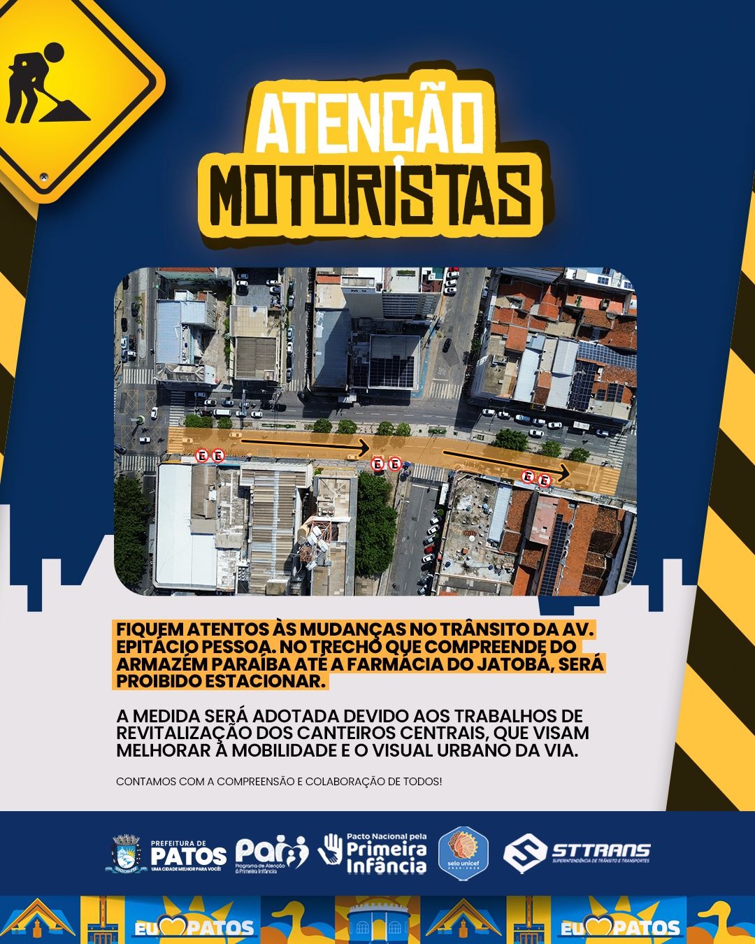 A Superintendência de Trânsito e Transportes de Patos (STTRANS), comunica aos motoristas que trafegam pela Avenida Epitácio Pessoa sobre mudanças no trânsito em um trecho da via. Devido aos trabalhos de revitalização dos canteiros centrais, que a partir desta quarta-feira, 11, será proibido estacionar no trecho que compreende do Armazém Paraíba até a Farmácia do Jatobá.
