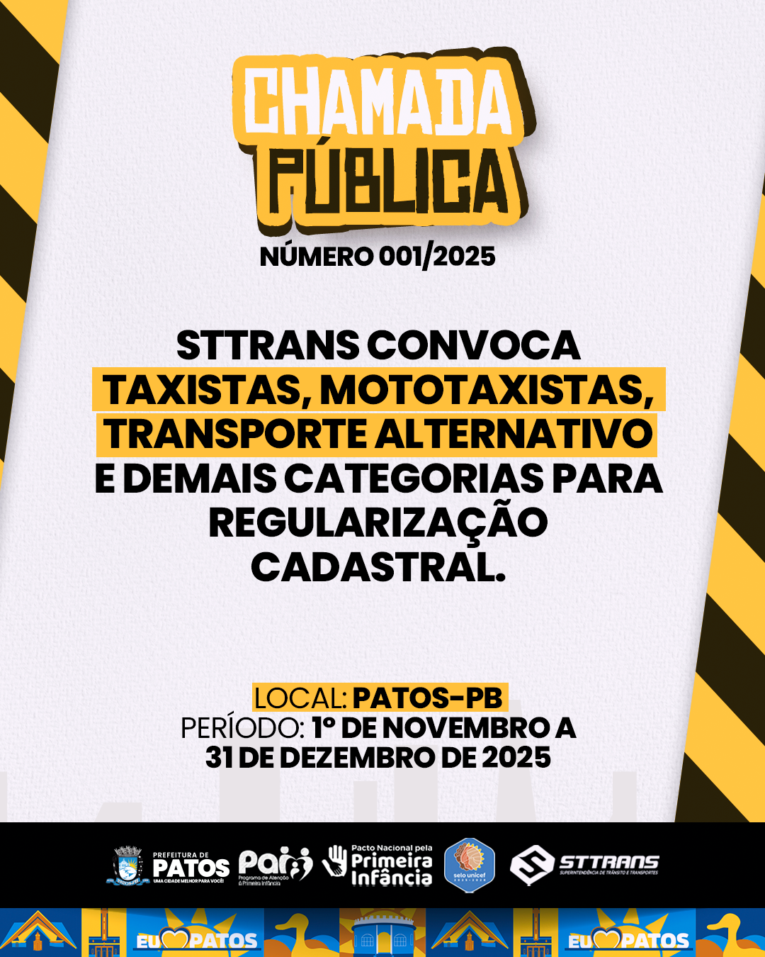 A Superintendência de Trânsito e Transporte de Patos – STTRANS lançou edital de Chamada Pública Nº 001/2025 que convoca os concessionários de serviço público taxistas, mototaxistas, transporte alternativo, carro de frete (carga e descarga), transporte escolar e carro de som para o período de renovação de alvará que terá seu início na próxima, segunda-feira, 03 de novembro.
